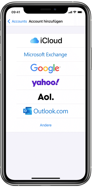 - Sollte dein E-Mail-Account bei einem anderen Anbieter sein, tippe auf „Andere“ (manuelle Einrichtung muss stattfinden)