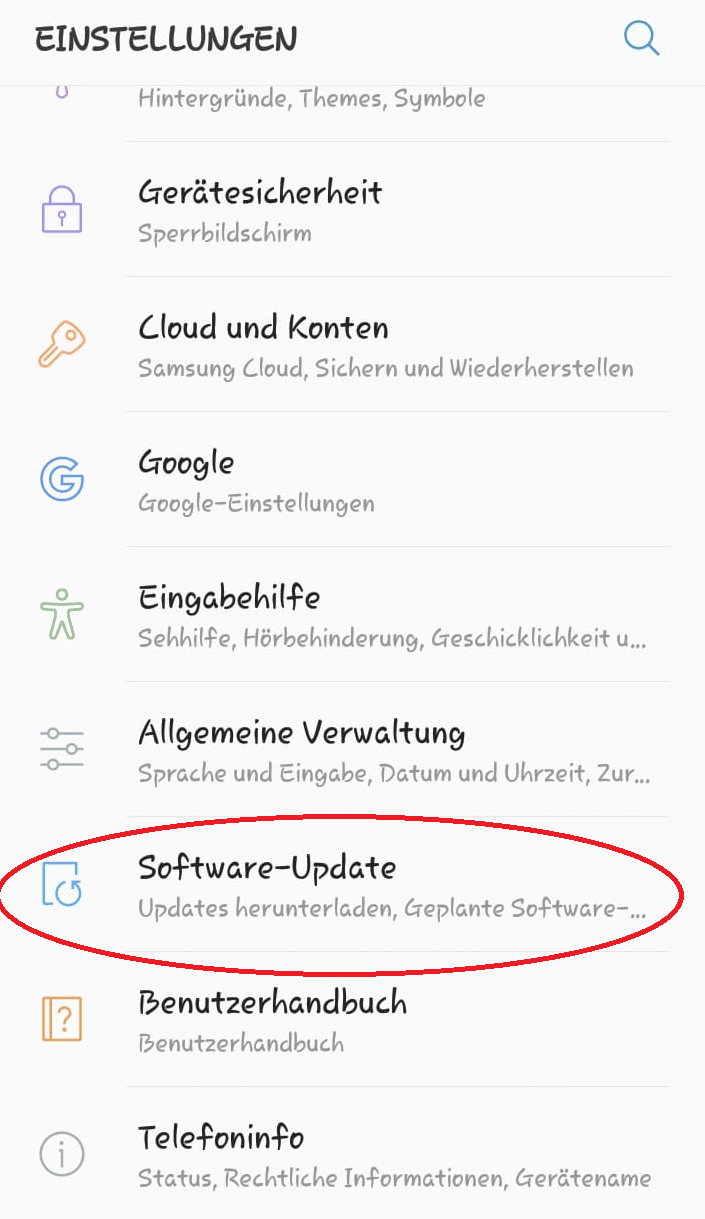 Die Benennung des vierten Punkts unterscheidet sich in Abhängigkeit vom Smartphone-Hersteller. Bei Samsung heißt er beispielsweise „Software-Updates“. Sollen automatische Updates aktiviert werden, besteht unter diesem Menüpunkt die Möglichkeit dazu.