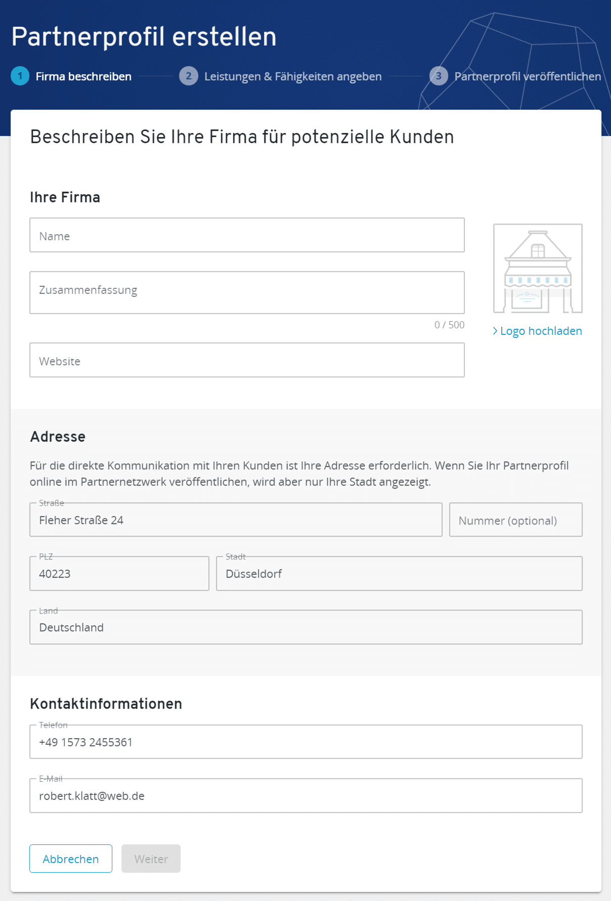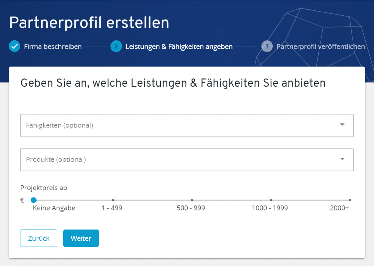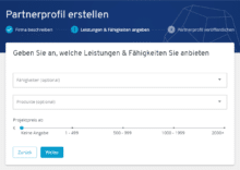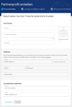 Das fertige Partnerprofil, das auf Wunsch öffentlich zur Kundensuche angezeigt werden kann, enthält neben den Adress- und Kontaktdaten auch noch eine Übersicht über die Fähigkeiten des Anbieters und zuvor abgeschlossene Projekte. Weil es zur späteren Kundengewinnung genutzt wird, ist eine ausführliche Beschreibung und ein Logo Pflicht, um nicht in der Masse der Anbieter unterzugehen.