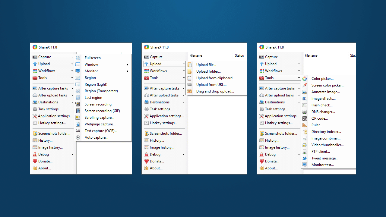 ShareX ist die Weiterentwicklung einer Freeware mit Namen „zscreen“, die sich bereits bewährt hat. Zu dem üblichen Fenster- oder Bildschirminhalt können auch Screenshots von Fensterlisten und sogar aktiven Monitoren angefertigt werden. Weiterhin kann die Form der Screenshots verändert werden. Dabei können Bildschirminhalte auch als Kreis, Dreieck, Ellipse, Polygon, in Diamantform oder auch als Freihandform festgehalten werden. Auch eine Lupe kann zum Einsatz kommen. Ein optionales Widescreen-Fadenkreuz und zuschaltbare Koordinaten verdeutlichen die genaue Bildschirmposition.