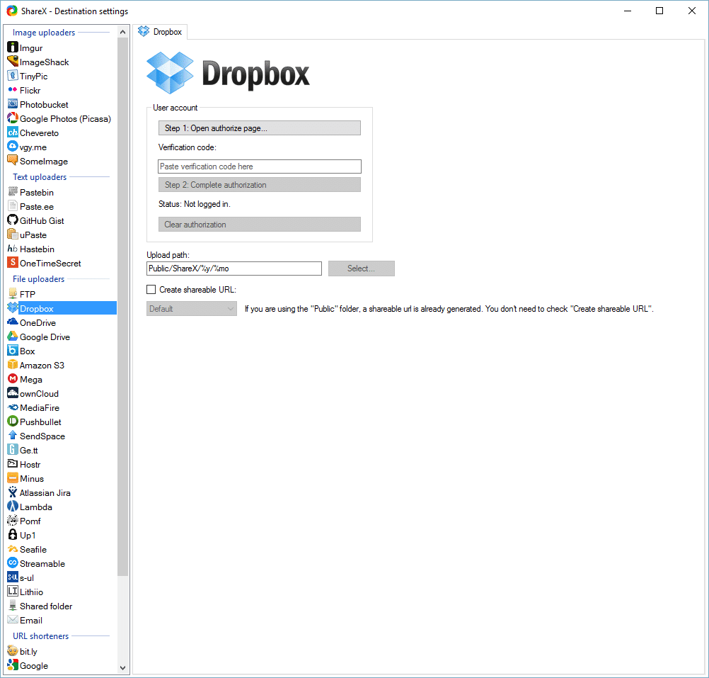 Auch besteht die Möglichkeit einer Verknüpfung über ShareX mit zahlreichen bekannten File-Uploadern. Dahinter verbirgt sich die Option, Screenshots automatisch bei Diensten wie imageshack.us, tinypic.com, imgur.com, flickr.com, Dropbox, Google Drive und photobucket.com hochzuladen.