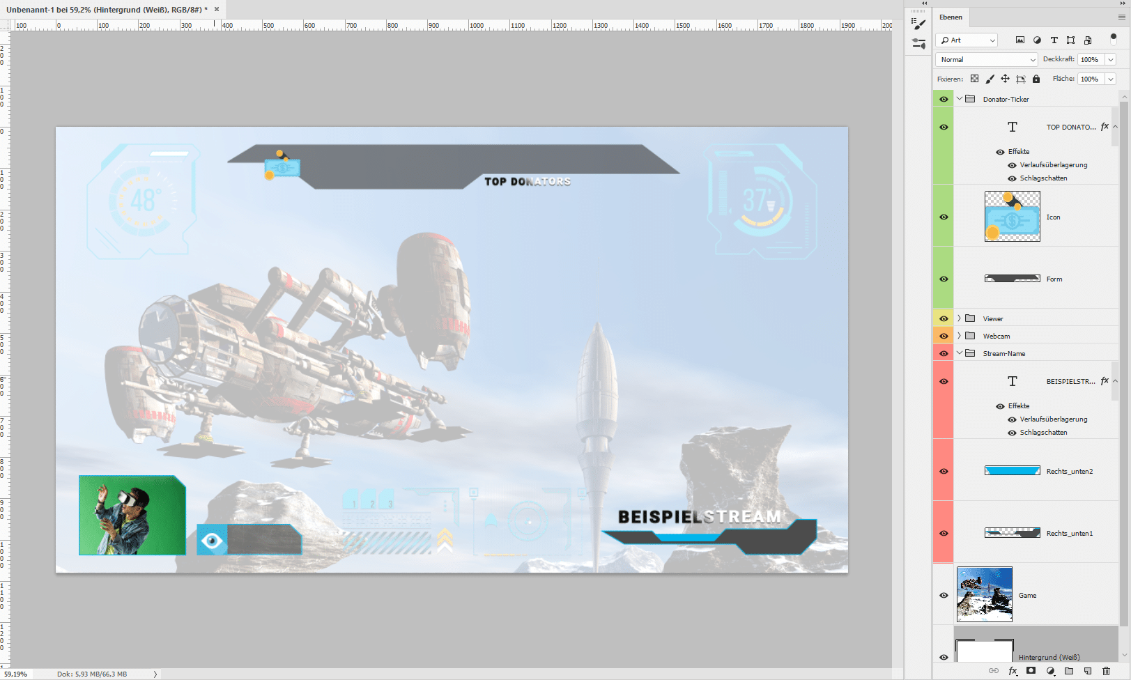 Streamlabs OBS bietet dir bereits eine Fülle an Möglichkeiten, Text in dein Design zu verpacken. Photoshop zum Beispiel kann hier noch mehr. Und wenn du schon deine Designelemente dort entwirfst, warum nicht auch gleich den dazu gehörenden Text? Mit dem Text-Werkzeug (Shortkey: T) bist du in der Lage, Beschreibungen für deine Platzhalter einzufügen oder diverse Informationen einzublenden. Zum Beispiel deinen Kanal-Namen oder deine Twitter- beziehungsweise Facebook-Page. Bedenke aber, dass du hier standardmäßig keine Google Fonts zur Verfügung hast. Dies kannst du jedoch auf fonts.google.com nachholen, dir dort deine Schriftarten aussuchen, welche du auch in Streamlabs OBS verwendest, und diese herunterladen. Einmal installiert, findest du diese auch in den Grafik- und Office-Programmen auf deinem PC. Hast du eine Schriftart gewählt und deine Platzhalter mit Labels versehen, kannst du im Menü über Ebene > Ebenenstil Effekte hinzufügen, wie zum Beispiel Schlagschatten, Verläufe oder Konturen. Vergiss nicht, dass du die eigentlichen Stream-Labels, also die automatisch generierten Info-Felder in Streamlabs OBS setzen musst und reserviere dafür genug Platz auf deinem Overlay. Steht dein Design, solltest du die einzelnen Bereiche in Gruppen zusammenführen, sofern du dies noch nicht erledigt hast. Markiere dazu die betroffenen Objekte in der Ebenen-Liste und kombiniere sie mit STRG+G zu einer Gruppe. Das vereinfacht den Exportvorgang. Rechtsklickst du nun auf eine deiner Gruppen, erscheint ein Kontextmenü, in dem du Exportieren als … auswählen kannst. Im folgenden Fenster siehst du nochmal eine Vorschau, stelle hier sicher, dass PNG als Dateiformat verwendet wird und sich ein Häkchen bei Transparenz befindet. Danach kannst du mit dem Button „Alle exportieren…“ das ganze als Datei speichern und diese im Streamlabs OBS importieren.