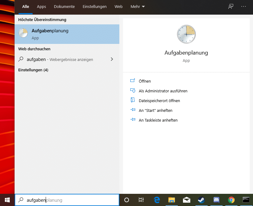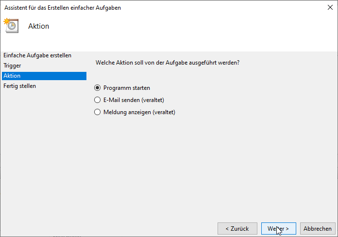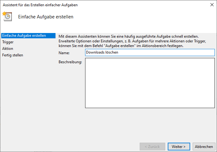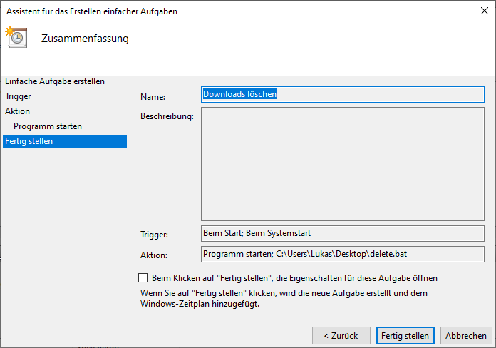 Hier steht uns die Windows-Funktion „Aufgabenplanung“ zur Verfügung. Im Suchfeld unter Windows 10 gebt ihr diesen Begriff ein und startet die Planung. Klickt oben links auf Aktion und geht auf Einfache Aufgabe erstellen. Im ersten Schritt legt ihr einen Namen für die Aufgabe fest, der zweite beschreibt, wann die Aktion ausgeführt werden soll. Für unser Tutorial nehmen wir Beim Start des Computers. Als nächstes können wir auswählen, dass ein Programm ausgeführt wird. Zum Schluss nur noch auswählen, wo unser Batch-File liegt. Ohne irgendwelche weiteren Parameter einzugeben, schließen wir die Prozedur ab – Fertig. Jetzt wird euer Download-Ordner bei jedem Start eures Computers geleert.