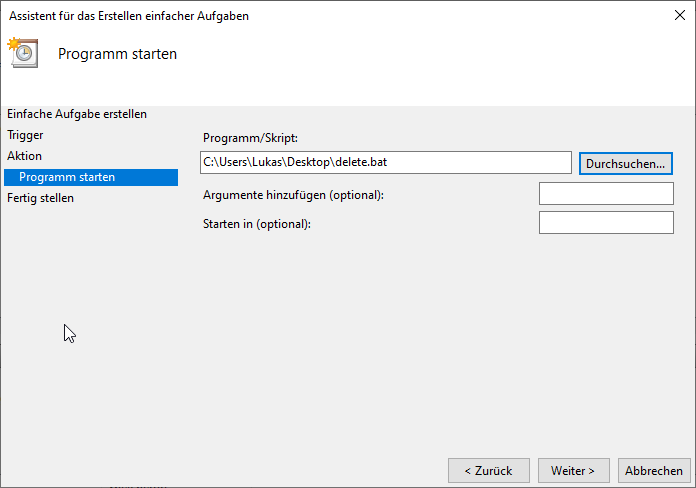 Unsere Datei haben wir jetzt erstellt, wenn ihr möchtet könnt ihr sie ausführen und schauen, ob es funktioniert. Es werden aber schon alle Dateien und Ordner gelöscht. Falls gewünscht könnt ihr noch ein weiteres Argument hinzufügen. Mit /d -X könnt ihr festlegen, wie alt die Dateien und Ordner im Verzeichnis sein dürfen. X ist dabei die Anzahl an Tagen. Mit dem nächsten Schritt wird das Skript automatisch ausgeführt.