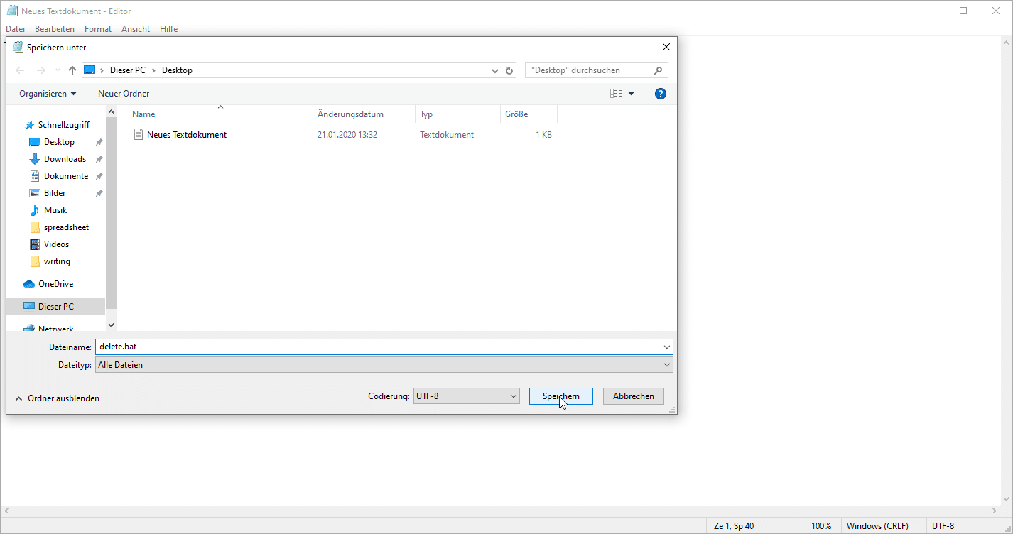 Im ersten Teil „%userprofile%\Downloads“ steht, welcher Ordner geleert werden soll. Über diesen Weg wird immer der Download-Ordner des ausführenden Users geleert. Ihr könnt aber auch jeden anderen Pfad in die beiden Anführungszeichen setzten. Der wichtigste Teil ist das Speichern des Textdokuments als BATCH-Datei. Im Editor klickt ihr auf Datei -> Speicher unter. Stellt den Dateityp auf „Alle Dateien“ und gebt bei Dateinamen beispielsweise delete.bat, wichtig ist aber die Endung .bat!