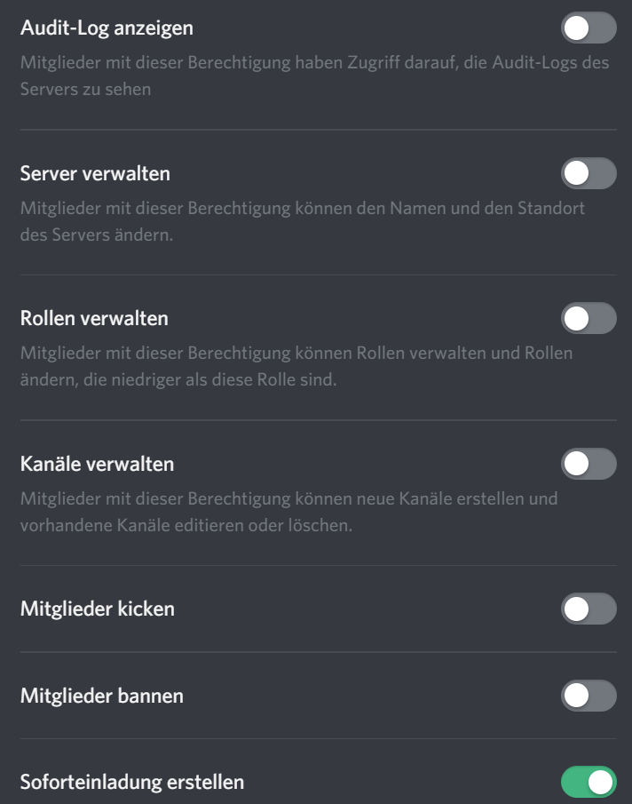 Soll der Server exklusiv für Freunde/Mitarbeiter/Subscriber bestimmt sein, sollte nicht jeder das Recht Soforteinladung erstellen bekommen. Um einem Server beizutreten ist es notwendig, dass man eine Einladung erhält.