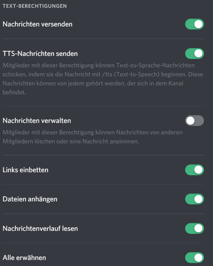 Ein nettes Feature von Discord ist Text-zu-Sprache. Schreibt jemand /tts vor seine Nachricht, wird sie laut vorgelesen. Für einige hilfreich, für andere einfach nur nervig. Mit der Berechtigung Verschicke Text-zu-Sprache-Nachrichten kann das für eine bestimmte Rolle unterbunden werden.