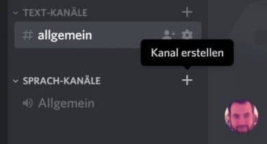 Nun seht ihr euren eigenen, sehr leeren Server. Discord unterteilt sich in Text- und Sprachchannels. Um einen entsprechenden Kanal im jeweiligen Bereich zu erstellen, bewegt ihr eure Maus in den gewünschten Bereich und klickt auf das „+“. Auch hier bieten sich aussagekräftige Namen an. Die erstellten Kanäle könnt ihr auch noch weiter bearbeiten und nur für bestimmten Rollen freischalten. Um zu den Einstellungen zu gelangen, klickt ihr auf das Zahnrad-Symbol hinter dem Namen.