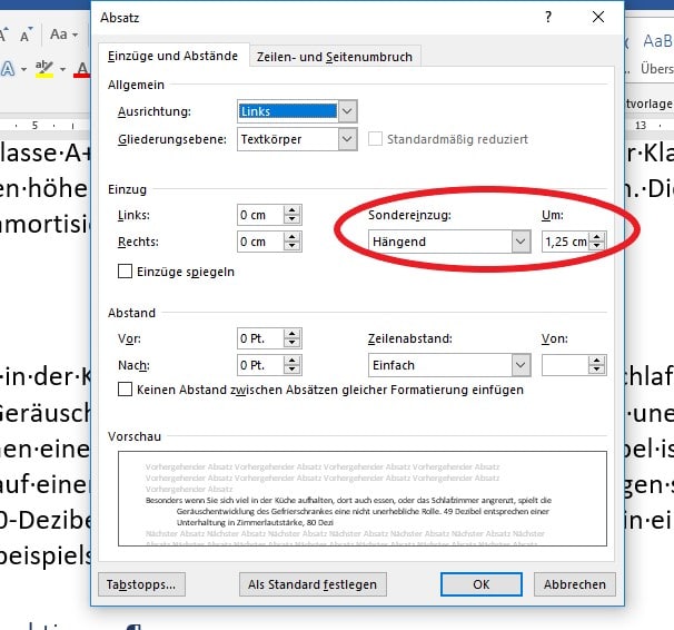 - Kontextmenü (Rechtsklick im betreffenden Absatz) -> „Absatz“ auswählen -> Dialogfeld „Absatz“, Einzüge und Abstände