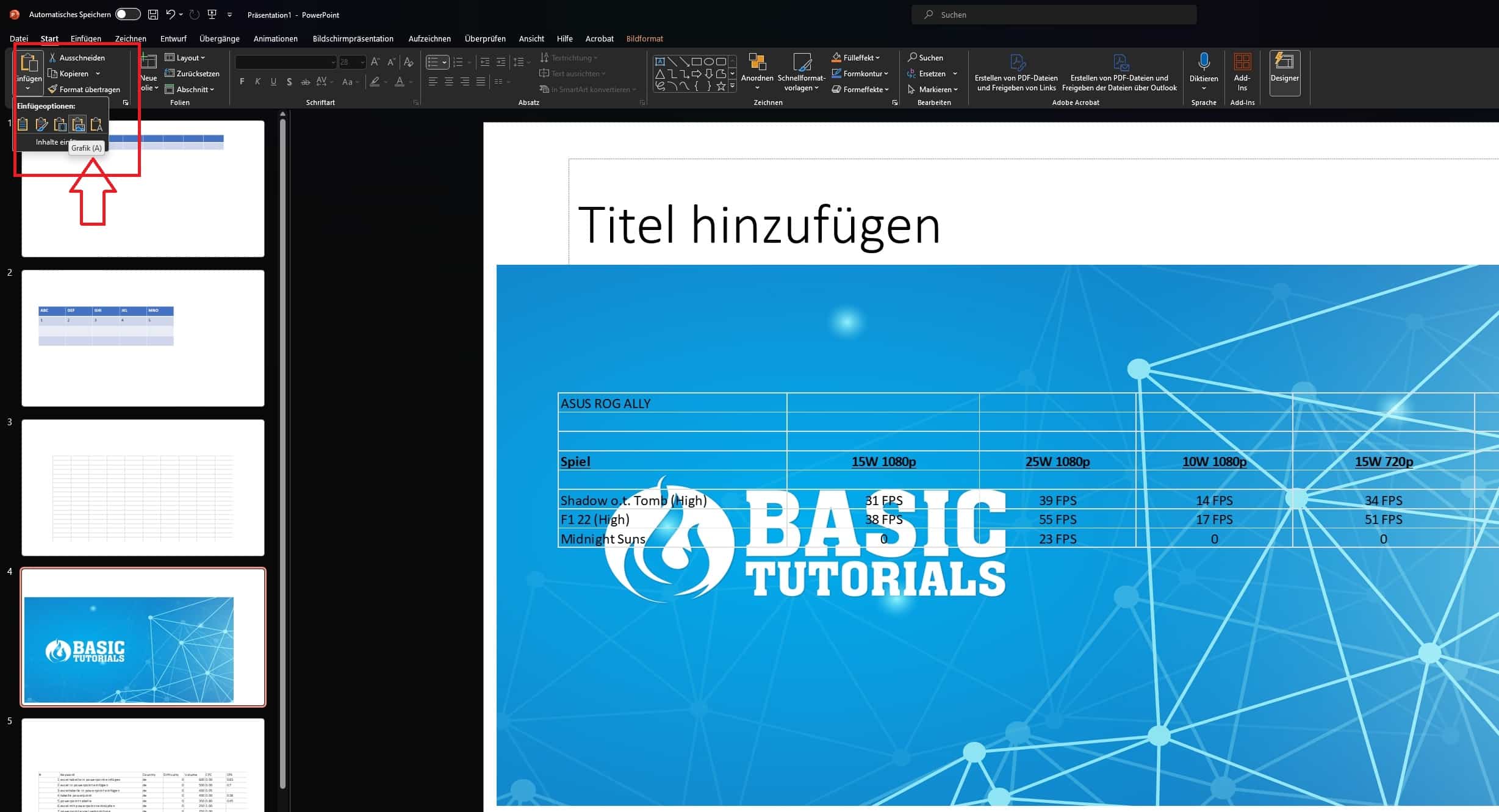 - Wechsele nun zur PowerPoint-Präsentation und zu der Folie, auf der die Tabelle als Grafik eingefügt werden soll.