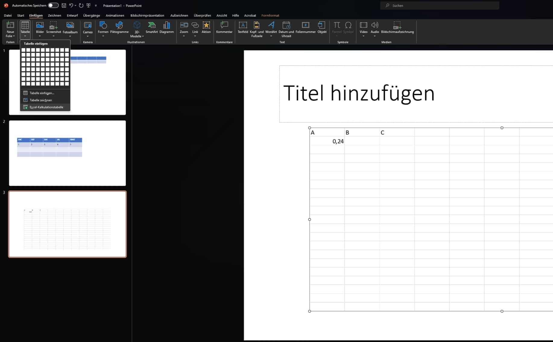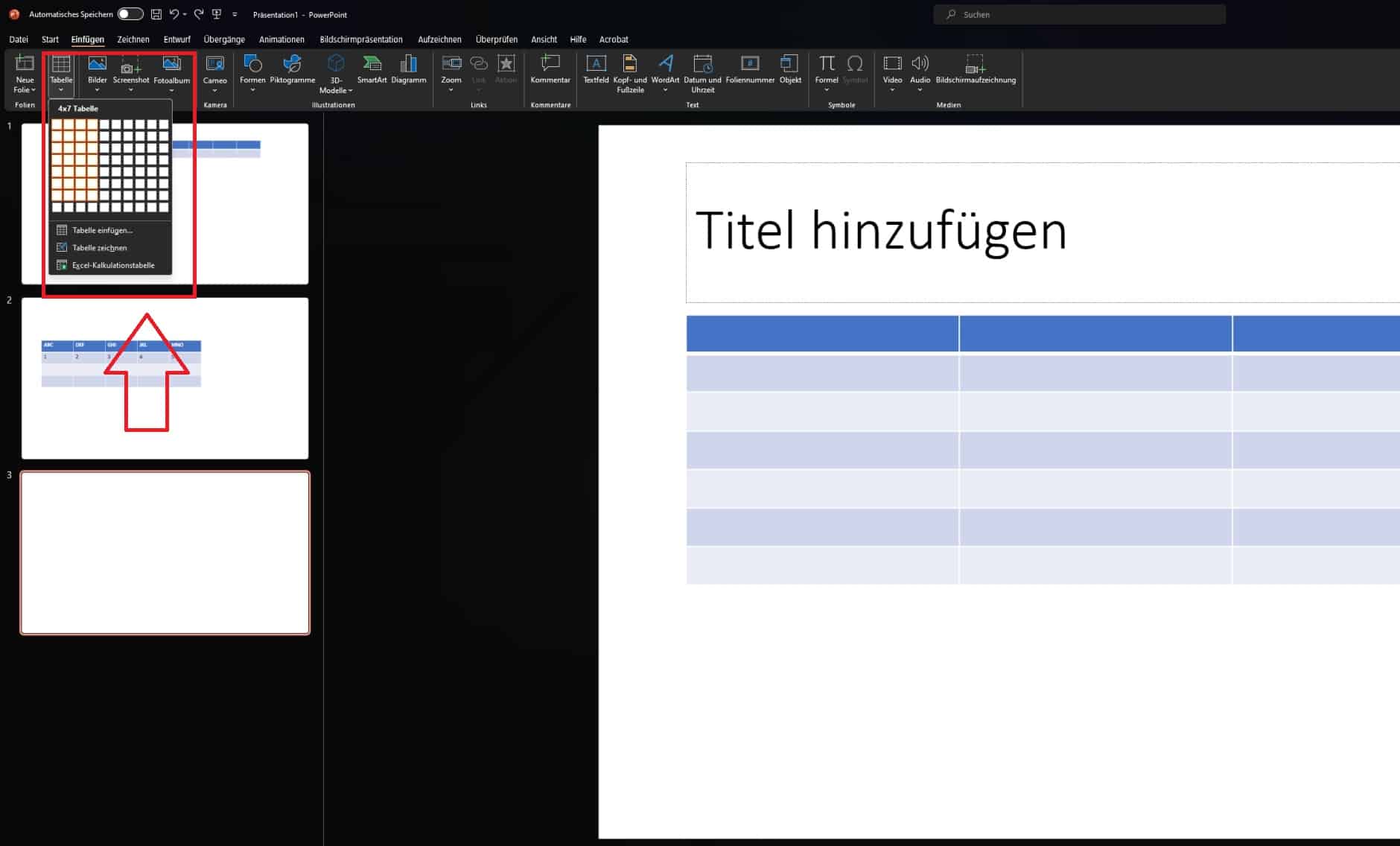 Alternativ kannst du im oberen Menü unter „Einfügen > Tabelle“ ebenfalls eine einfache Tabelle zeichnen und diese dann auf deiner Folie darstellen lassen. Diese einfachen Tabellen sind für die meisten Zwecke mehr als ausreichend. Komplexe Funktionen und Berechnungen sind damit aber nicht möglich.