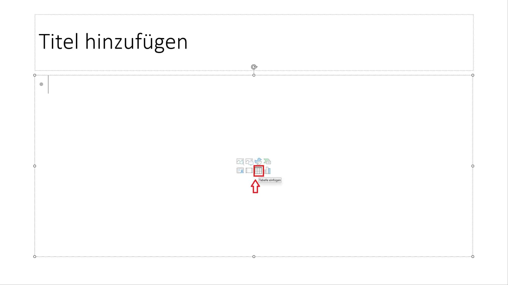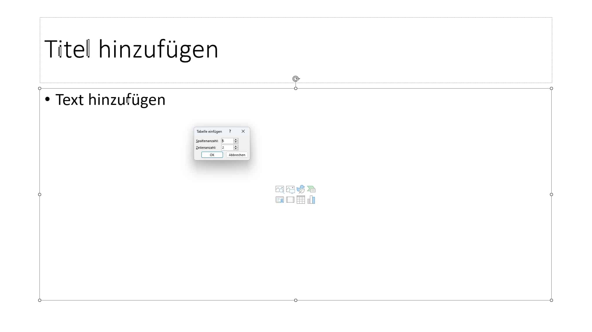 Es gibt mehrere Möglichkeiten, eine Tabelle in Excel zu erstellen. Einerseits kannst du auf einer neuen Folie im Textblock auf das Tabellensymbol klicken. Dann öffnet sich ein Fenster, in dem du die Anzahl an Spalten (horizontal) und die Zeilenanzahl (vertikal) festlegen kannst.