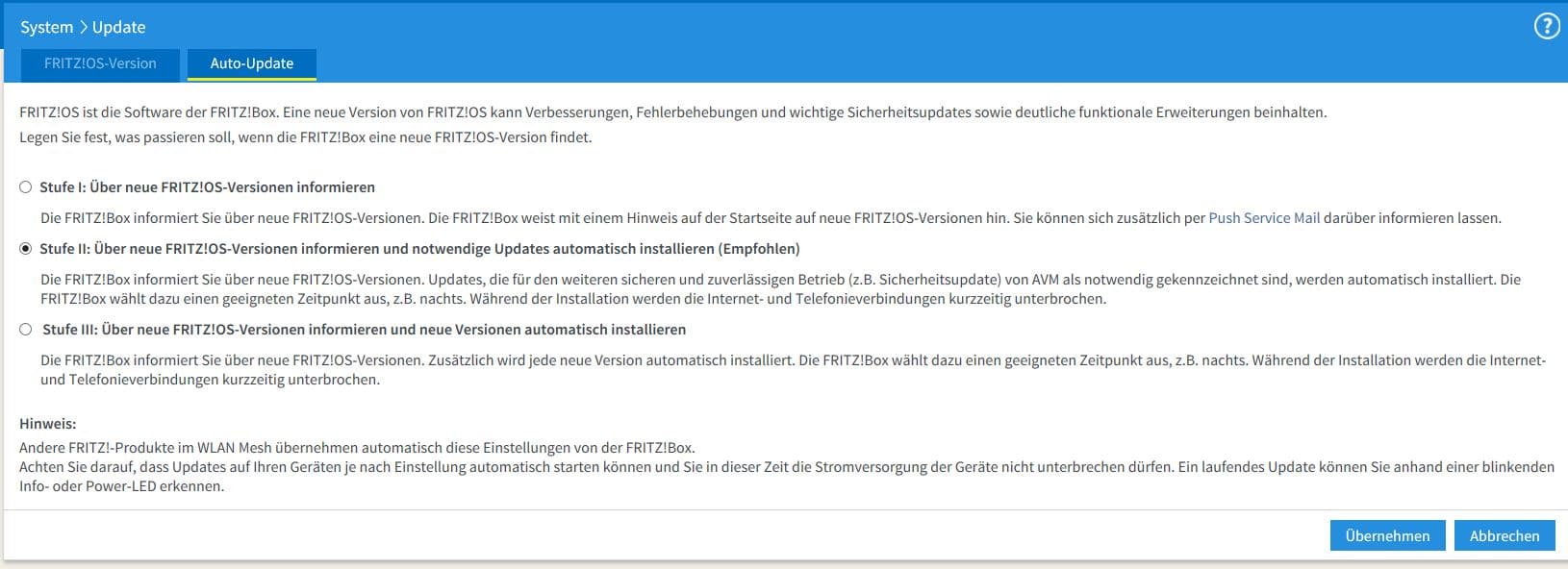 Stufe II informiert euch ebenfalls über neue Updates. Jedoch installiert die FRITZ!Box sicherheitsrelevante und leistungssteigernde Updates automatisch, um die höchste Sicherheit und beste Performance zu bieten.