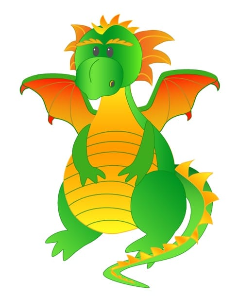 Wenn Du eine Fläche einfärben willst, wähle sie aus und bestimme eine Farbe. Über Fenster > Farbfelder oder Farbe hast du zugriff auf die Farbtools von Illustrator. Mit (x) kannst Du einfach zwischen Fläche und Kontur wechseln, dies erleichtert Dir das einfärben deiner Figur. Mit dem Pipetten-Werkzeug (i) kannst Du auch andere Farben auswählen, die schon in Deinem Bild vorkommen. Mein Drache sieht nach der Koloration beispielsweise so aus: