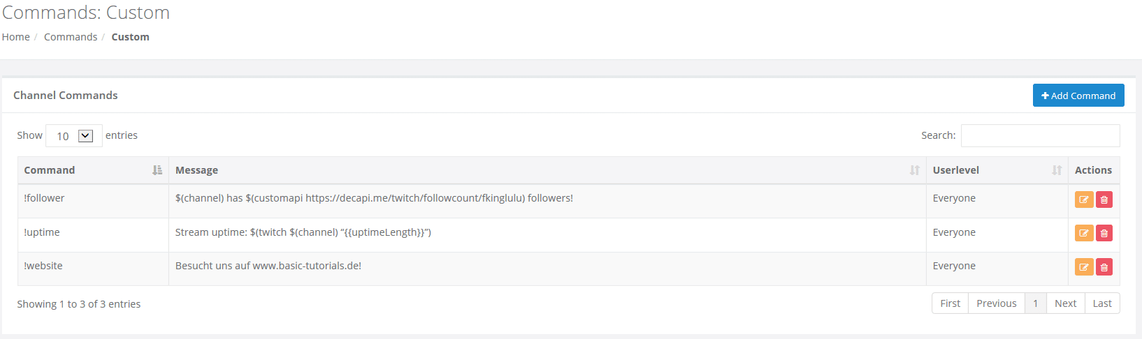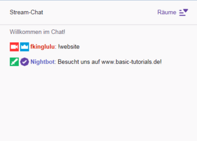 - !commands – Zeigt alle möglichen Kommandos des eingebenden Nutzers. Moderatoren können über den Befehl Kommandos bearbeiten.