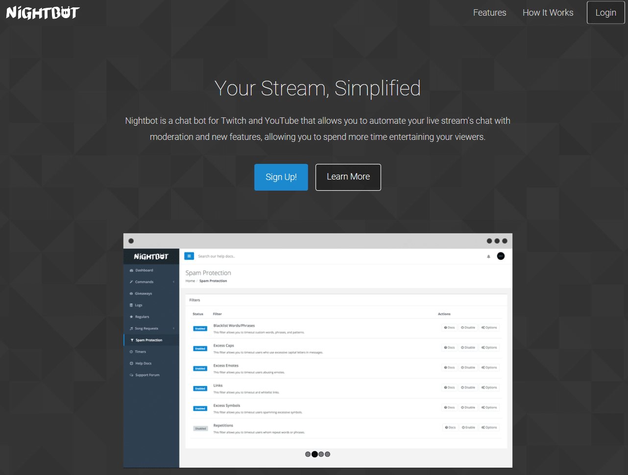 Zur automatischen Administration kann der Nightbot auch die Nachrichten überwachen. Mit Filtern können Wörter festgelegt werden, die zu einer Verwarnung führen. Wird ein Wort aus der Liste geschrieben, wird der Nutzer verwarnt. Ähnliche Regeln können für das Spammen für Emoticons festgelegt werden. Ebenso können bestimmte Links oder das generelle Posten von Links untersagt werden, selbst eigene Regeln sind möglich.