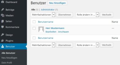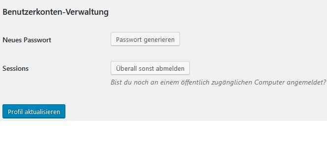Ein sicheres Passwort wird euch bei der Einrichtung von WordPress als auch beim Hinzufügen neuer Benutzer automatisch vorgeschlagen. Die Liste aller Benutzer findet ihr in der linken Sidebar im WordPress-Dashboard, wo ihr sie problemlos ändern könnt. Wählt hierfür den entsprechenden Benutzer aus und geht unter dem Benutzernamen auf „Bearbeiten“. Jeder Benutzer kann einen eigenen Benutzernamen sowie ein Passwort anlegen. Scrollt dann nach unten zu der Benutzerkonten-Verwaltung. Nun könnt ihr unter „Neues Passwort“ ein neues Passwort generieren oder selber eingeben.