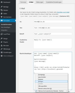 Das vom Nutzer ausgefüllte Kontaktformular wird euch per E-Mail zugesandt. So ist eine schnelle, vertrauliche und einfache Kommunikation möglich. Die im Kontaktformular unter „Formular“ hinzugefügten und geänderten Felder, welche ihr ebenfalls in der E-Mail übermittelt bekommen wollt, müsst ihr dementsprechend unter „E-Mail“ in den Nachrichtenkörper einfügen. Das Plugin verwendet immer die im WordPress angegebene E-Mail-Adresse. Wollt ihr diese ändern, könnt ihr im Feld „An“ eine andere E-Mail-Adresse angeben.