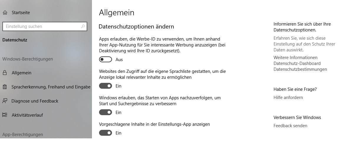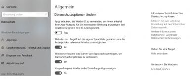 Eine wichtige Einstellung findet ihr bei dem Menüpunkt Allgemein – und zwar die Werbe ID. Wenn diese aktiviert bleibt, kann Microsoft auf euch zugeschnittene Werbung anzeigen lassen. In den Datenschutzeinstellungen lässt sich auch genau bestimmen, welche App auf was zugreifen darf. Es ist nämlich nicht selten, dass eine App auf euren Standort oder eure Kamera zugreifen kann. Wenn ihr das nicht wollt, könnt ihr es den Apps hier untersagen.