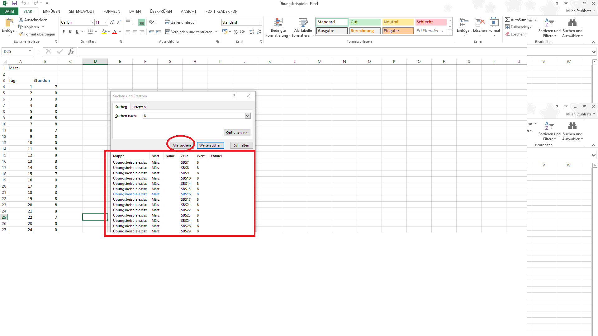Oder du wählst Alle Suchen. In diesem Fall werden dir alle Suchergebnisse mit ihrer Spalte und Zeile im markierten Bereich angezeigt und du kannst durch draufklicken dahin springen.