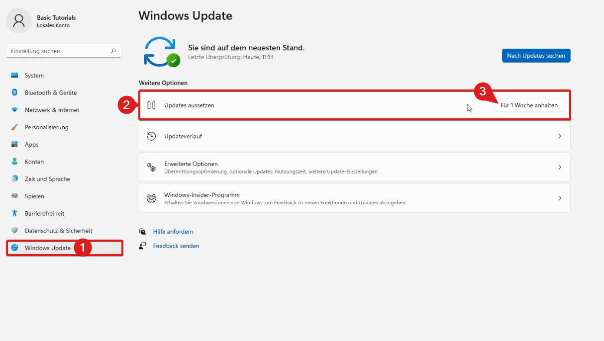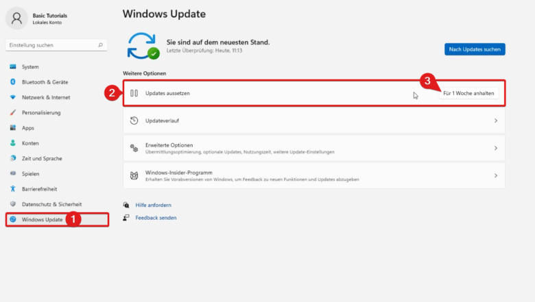 - Klicke rechts auf die Schaltfläche „Für 1 Woche anhalten“, um Updates für diesen Zeitraum zu pausieren.