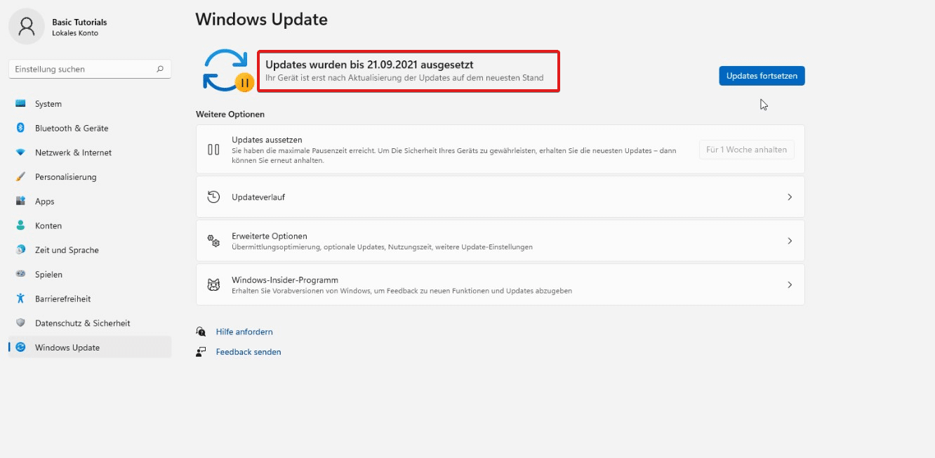 - Ganz oben siehst du dann, bis zu welchem Datum die Updates angehalten werden. Möchtest du sie vor Ablauf der Zeit fortsetzen, musst du nur auf den blauen Button „Updates fortsetzen“ klicken (Bild 2).