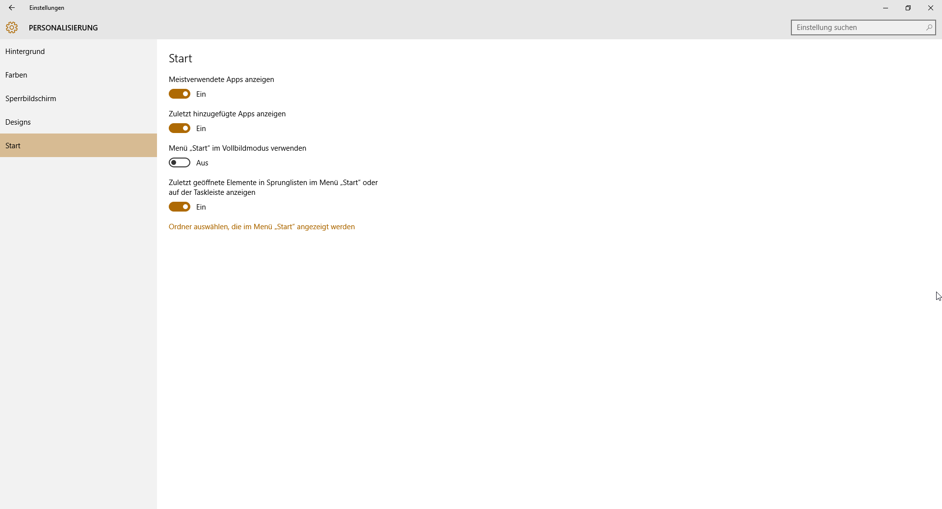 Auf dem Desktop öffnet ihr euer Infocenter, klickt dort auf „Alle Einstellungen“ und geht in den Unterpunkt „Personalisierung„. Im neuen Fenster findet sich nun noch „Start“ und ganz unten „Ordner auswählen, die im Menü „Start“ angezeigt werden„. Nun habt ihr noch mehrere Möglichkeiten, die sonst standardmäßig ausgeblendet sind. Damit ist alles getan – ein- oder ausblenden, mehr hat Microsoft nicht vorgesehen.