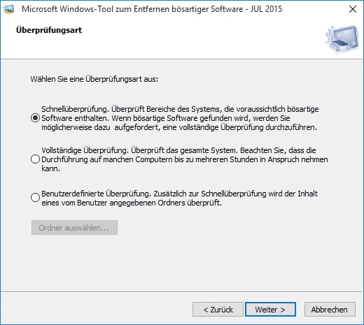 - Benutzerdefinierte Überprüfung: Erst wird eine „Schnellüberprüfung“ durchgeführt. Zusätzlich könnt ihr Ordner festlegen, die durchsucht werden sollen.