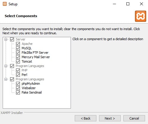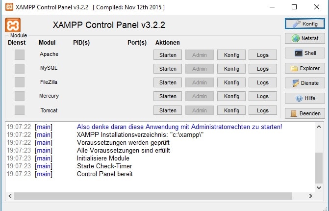 Auf https://www.apachefriends.org könnt ihr XAMPP herunterladen und installieren. Die Installation ist nicht schwer. Wenn ihr die Installationsdatei öffnet, könnt ihr die Komponenten auswählen, die ihr installiert haben wollt. Lasst einfach überall den Haken drin und klickt auf „weiter“. Jetzt müsst ihr nur noch das Verzeichnis auswählen und schon habt ihr euren eigenen Server auf dem PC. Die Benutzeroberfläche ist selbsterklärend.