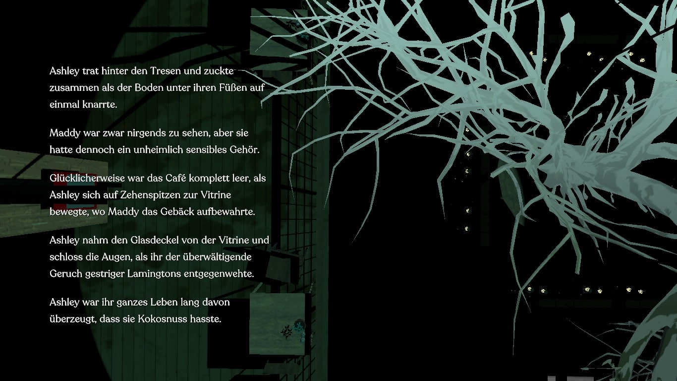 Aus diesen Wörtern könnt ihr am Ende des Kapitels sieben Stück auswählen, die euch dann Tokens verschiedener Kategorien gewähren. Danach dürft ihr in Ich-Perspektive das Terminal erkunden, wobei ihr Erinnerungen – kleine Bonusgeschichten – finden könnt. Habt ihr diese gefunden könnt ihr sie mithilfe der Tokens freischalten und lesen. Diese Geschichten sind über simplen Text erzählt, ohne zusätzliche Bilder oder musikalische Untermalungen, aber auch der Schreibstil ist hier anders, sodass er mehr an einen Roman erinnert. Die Erinnerungen können ungemein hilfreich sein, um ein tieferes Verständnis für die Geschichte zu entwickeln – sind aber nicht notwendig. Hat man das Spiel durchgespielt erhöht sich die Anzahl an Tokens, die man besitzt, sodass man alle Erinnerungen freischalten kann. Damit sind mehrere Spieldurchläufe nicht nötig.