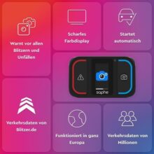 Der Saphe Drive Pro ist ein Verkehrswarner, der Echtzeitinformationen zu Geschwindigkeitskontrollen und Gefahrenstellen bereitstellt. Das Gerät verfügt über ein 1,54-Zoll-Farbdisplay, das aktuelle Geschwindigkeitsbegrenzungen, bevorstehende Tempolimits und die eigene Geschwindigkeit anzeigt.