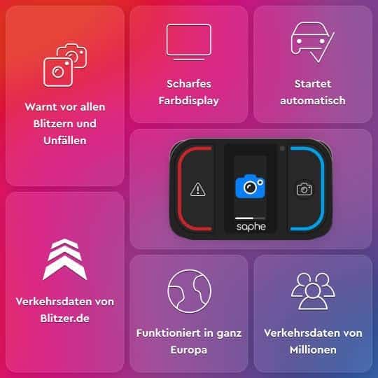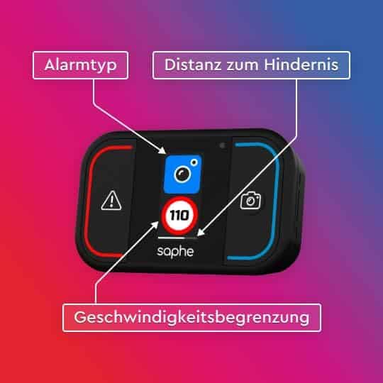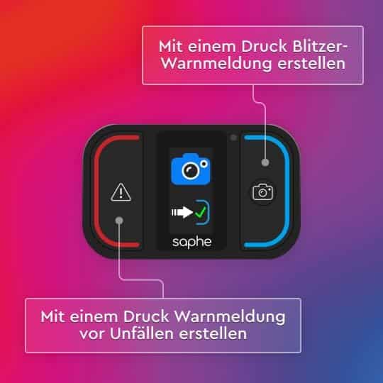 Warnungen erfolgen durch akustische Signale und LED-Anzeigen. Die Daten stammen aus einer Community von Millionen Nutzern und werden in Echtzeit bereitgestellt. Der Saphe One+ funktioniert europaweit und hat eine Batterielaufzeit von 2 bis 3 Jahren.
