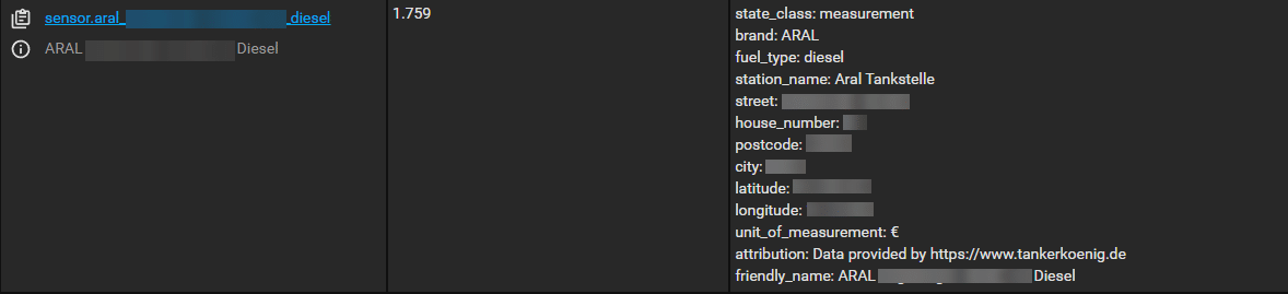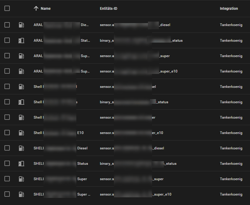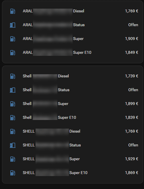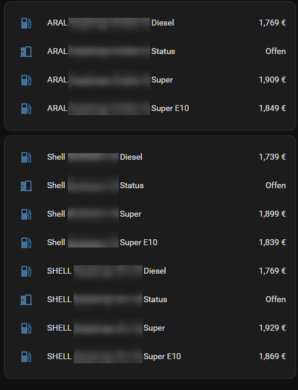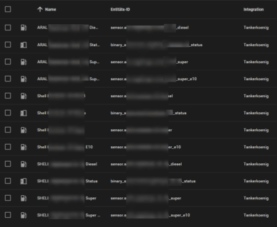Die Einrichtung selbst ist auch schnell abgeschlossen. Nach der Angabe der Region (eher ein Platzhaltername) sowie des API-Keys können wir noch auswählen, welche Kraftstoffe angezeigt werden sollen und wie der Suchradius ist. Nach Abschluss wählen wir anschließend noch die Tankstellen aus, welche wir in Home Assistant haben wollen und fertig. Nun bekommen wir zur ausgewählten Tankstelle und Kraftstoff die Preise angezeigt – als komplette Entität.