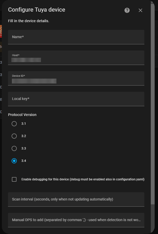 Sehr brauchbare Anleitung. Hat alles genau so funktioniert. Vielen Dank! Vielleicht sollte man noch hinzufügen, dass im Local-Tuya „Hinzufügen-Fenster“ unter Hosts die IP-Adresse der Steckdose (oder anderer Geräte) eingetragen werden muss. Nicht die von Home-Assistant.