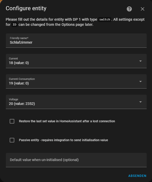Bei erfolgreichem Abschluss erkennt die Integration, dass es sich um einen Schalter (switch) handelt. Auch einige Werte werden abgefragt, diese müssen spezifisch zu geordnet werden. Current, Current Consumption sowie Voltage sind die Nummern 18, 19 und 20 (in dieser Reihenfolge).