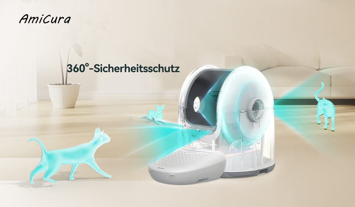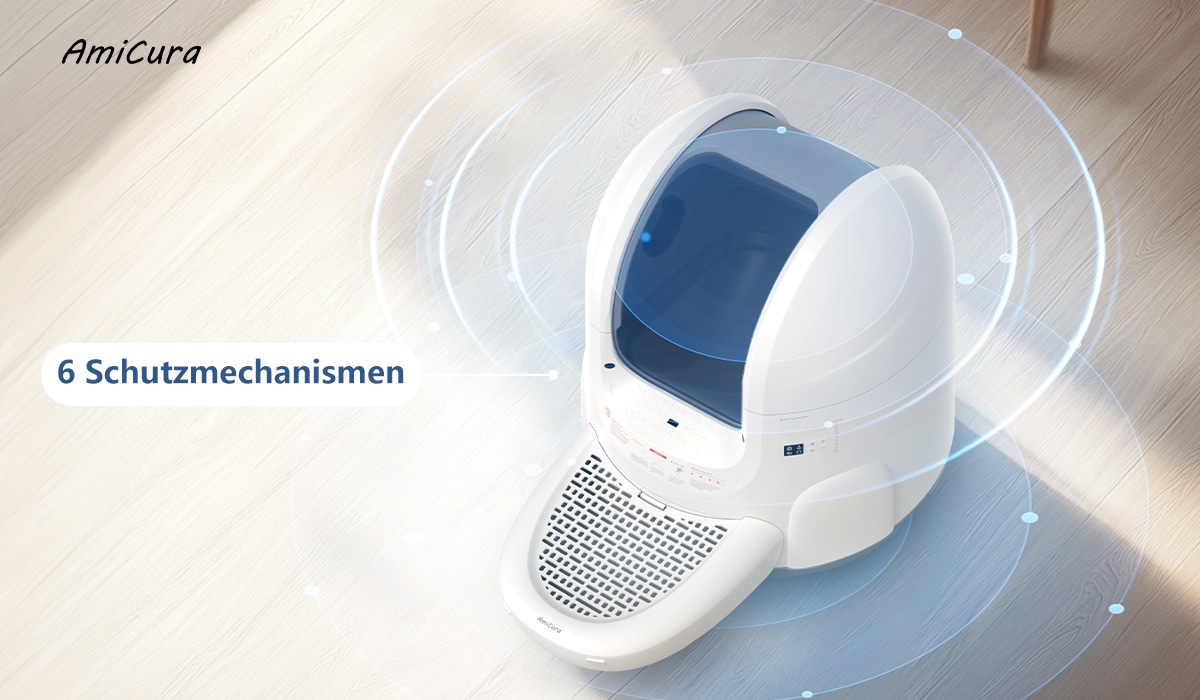 Safety first: Das intelligente Katzenklo Amicura Cura 2 verfügt über sechs Sicherheitsmechanismen, die einen umfassenden 360°-Schutz für eure Katze bieten. Es ist mit hochsensiblen Infrarotsensoren am Eingang, im Inneren und an der Rückseite ausgestattet, um in Echtzeit zu überwachen, ob sich eine Katze in der Toilette oder in unmittelbarer Nähe befindet.