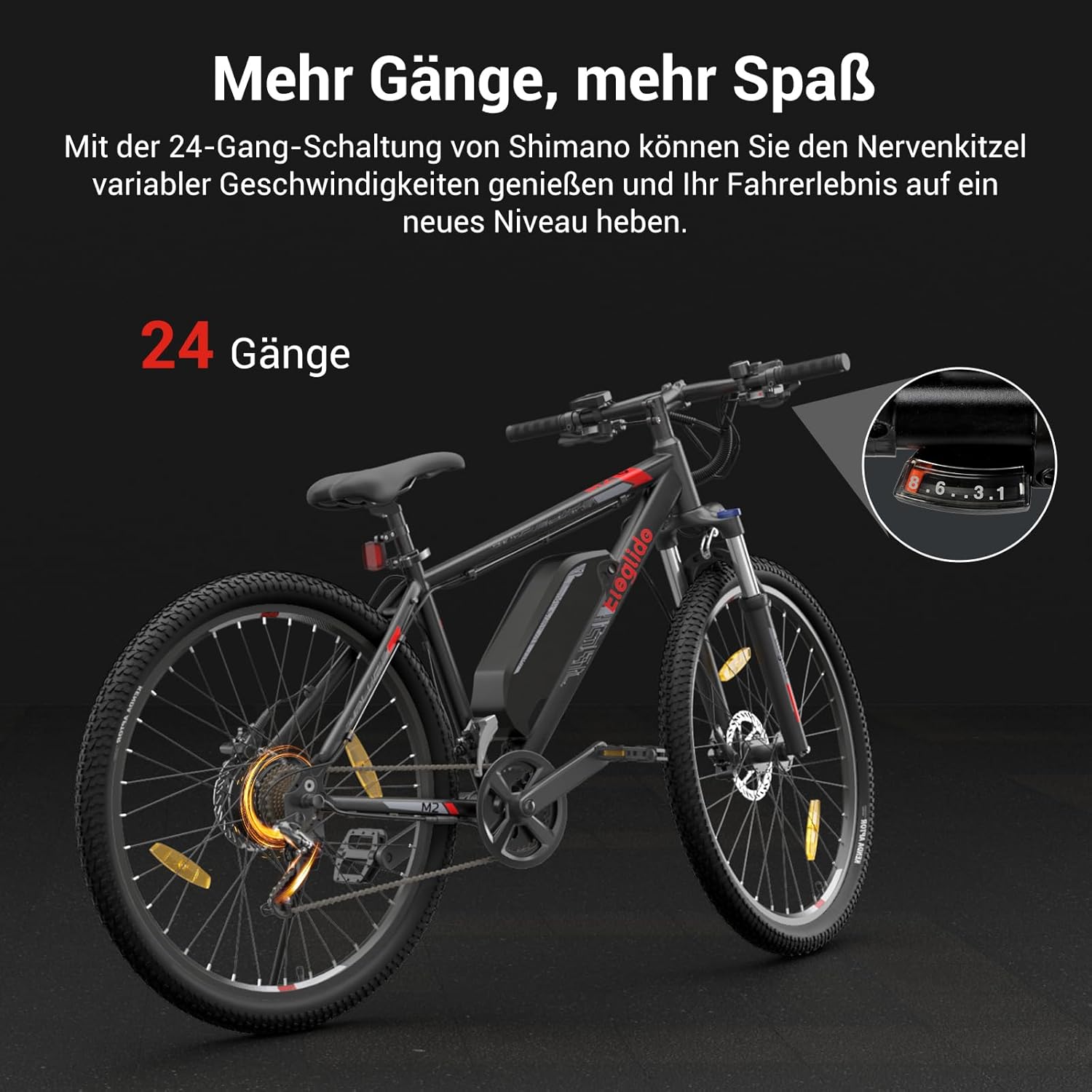 Das M2 ist darüber hinaus mit einer 24-Gang-Schaltung von Shimano ausgestattet, mit der ihr im manuellen Modus sämtlichen Gegebenheiten der Strecke gewappnet seid und selbst steile Anstiege problemlos meistert.