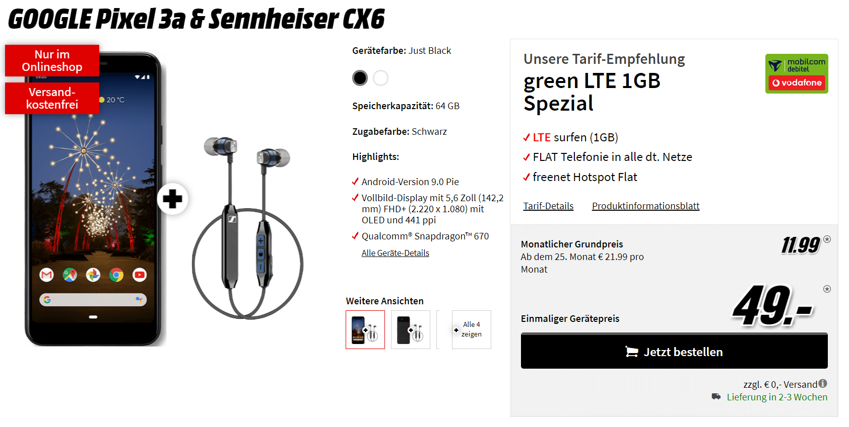 Als Hardware gibt es ein Google Pixel 3a, das aktuell laut Idealo 399 Euro kostet. Zusätzlich gibt es einen Sennheiser CX6 Kopfhörer, der bei 75,90 Euro liegt.
