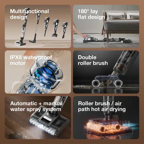Selbst in den Fasern verworrenen Staub und Schmutz nimmt die Teppichbürste in Kombination mit dem 480 Watt starken, nach IPX8-wasserfesten Motor problemlos auf und liefert so eine zuverlässige Reinigungsleistung auf Boden, Teppich, Bett und anderen Bereichen.