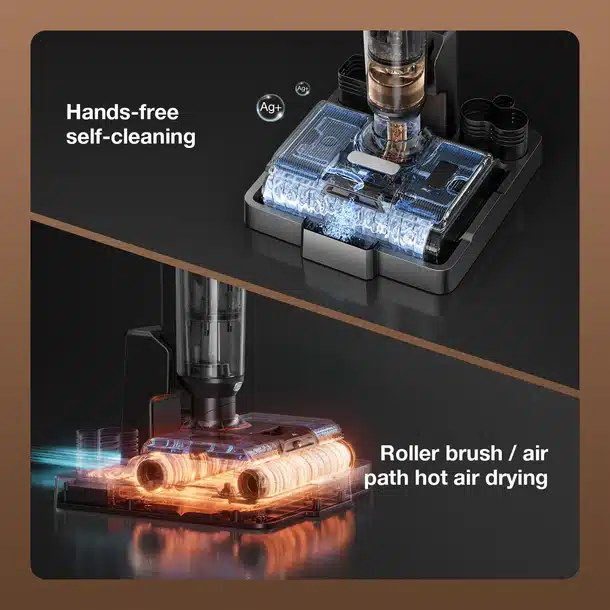 Das Selbstreinigungssystem reinigt den PW 11 Pro Max im Nachgang, entfernt Schmutz und Haare und reinigt das Wasser mit antibakteriellen Silberionen, während der Akkusauger dank Heißlufttrocknung Bürstenrollen, Luftweg und Schmutztank gründlich mit heißer Luft trocknet, um Schimmel und Geruch zu verhindern.