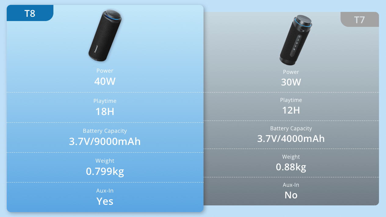 - T8 bietet 40W omnidirektionalen Klang mit langlebigem Akku für unterwegs