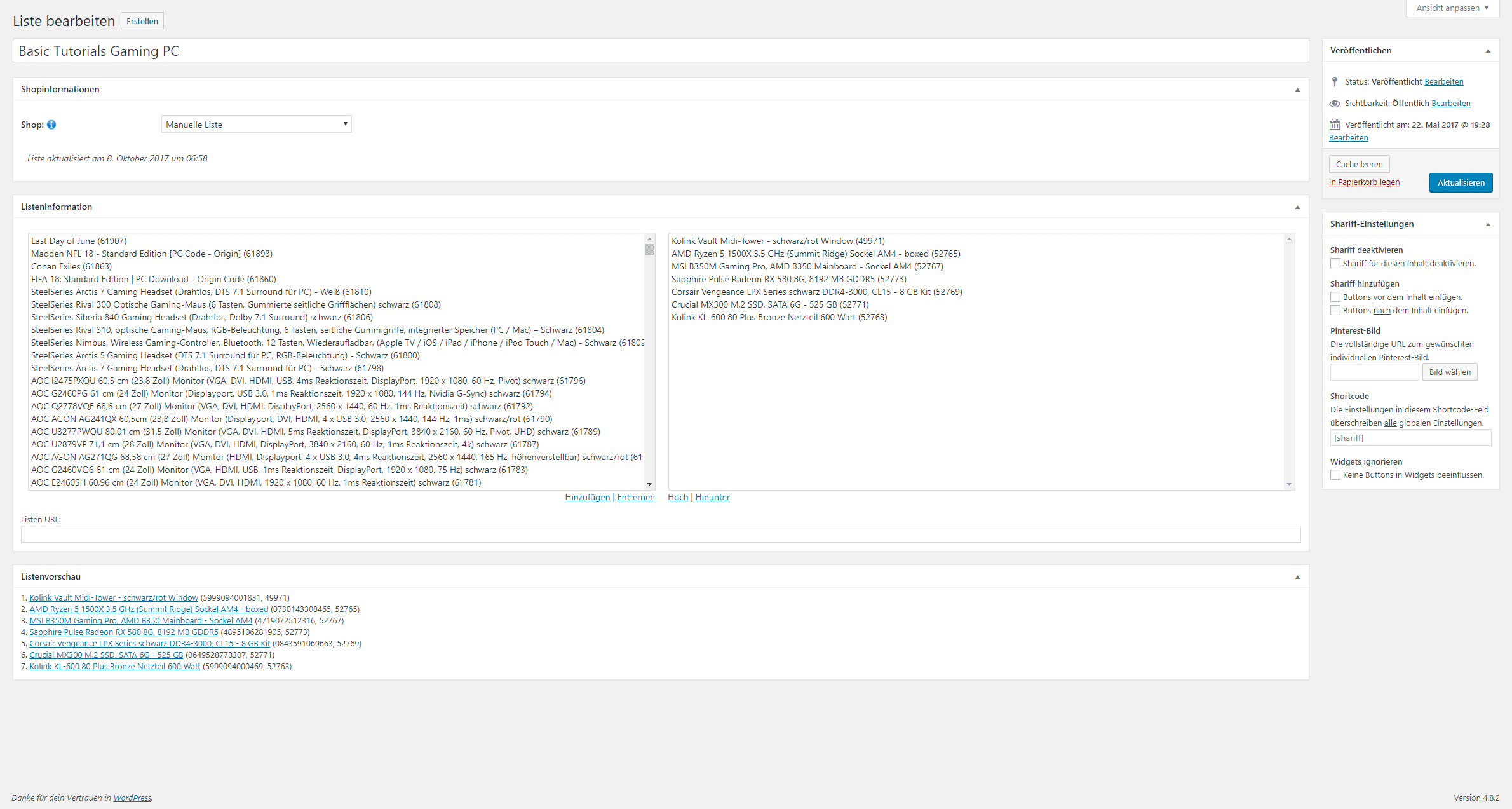 Bereits angelegte oder importierte Produkte lassen sich Listen zuordnen, die selbst angelegt werden können. So ist es dem Affiliate ohne größeren Aufwand möglich, Produktkategorien zu schaffen und diesen die einzelnen Produkte zuzuordnen. Neben dem Erstellen manueller Listen ist es jedoch auch möglich, bereits fertige Bestseller- oder ähnliche Listen zu verwenden. Das Anlegen manueller Listen ist nur in den Bezahlversionen möglich.