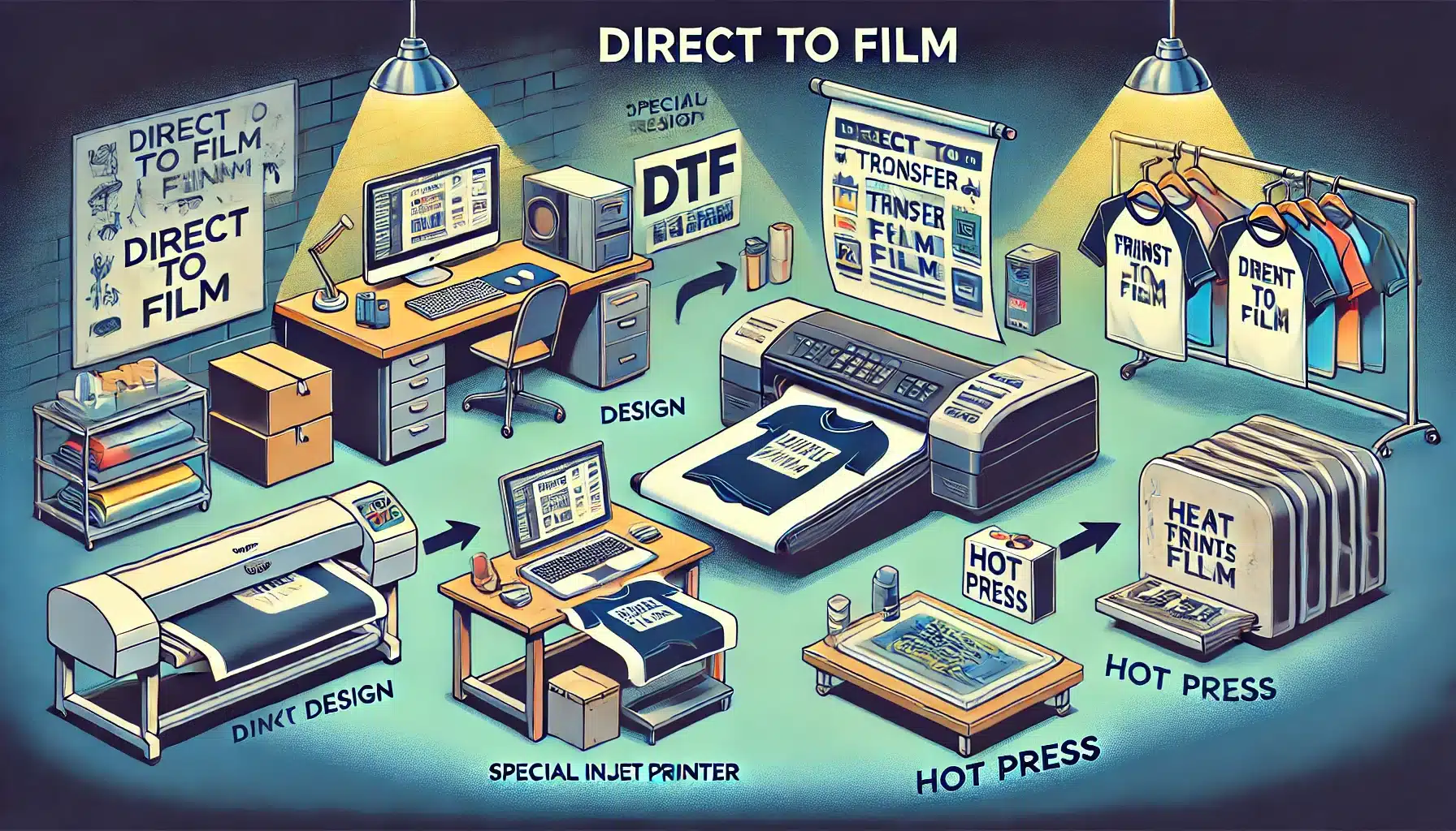 Das Direct to Film (DTF)-Druckverfahren ist eine andere Bezeichnung für den digitalen Transferdruck. Wie die englische Bezeichnung impliziert, wird hierbei direkt auf eine Folie (englisch Film) gedruckt. Das Abbild auf der Folie wird dann in einem Transferdruckverfahren durch eine Thermotransferpresse auf einen Bedruckstoff gedruckt. Ausgangspunkt des Drucks auf die DTF-Transferfolie ist hierbei eine Datei in einem Computer, die den Druck durch einen Tintenstrahldrucker mit speziellen Farben steuert. Die Herstellung einer Druckform wie etwa beim Siebdruck entfällt beim Digitaldruck, was den Herstellungsprozess der DTF-Transferfolien erheblich verkürzt und vereinfacht.