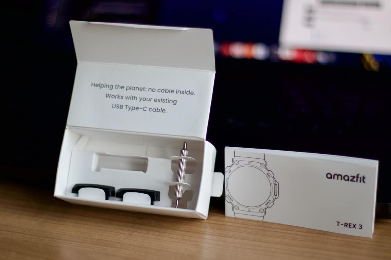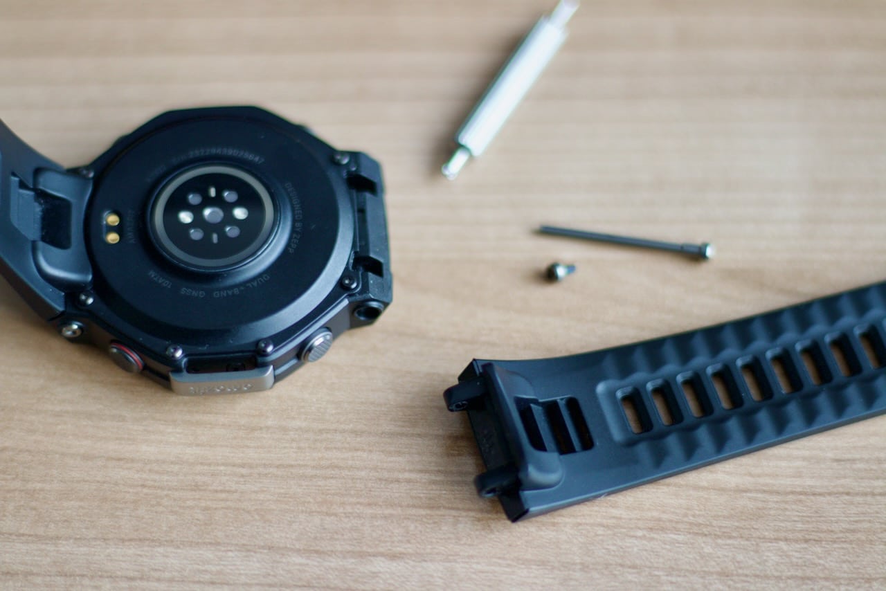 Das Armband der Uhr ist wechselbar, allerdings erfordert der Austausch einen speziellen Schraubendreher, der im Lieferumfang enthalten ist. Das mitgelieferte Armband punktet mit zwei stabilen Laschen, die dank spezieller Fixierungselemente nicht verrutschen. Dies sorgt für einen sicheren Sitz, selbst bei intensiven Bewegungen oder längeren Tragezeiten. Insgesamt kombiniert die Amazfit T-Rex 3 ein funktionales Design mit einer robusten und durchdachten Verarbeitung, die sowohl optisch als auch praktisch überzeugt.