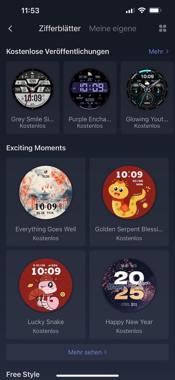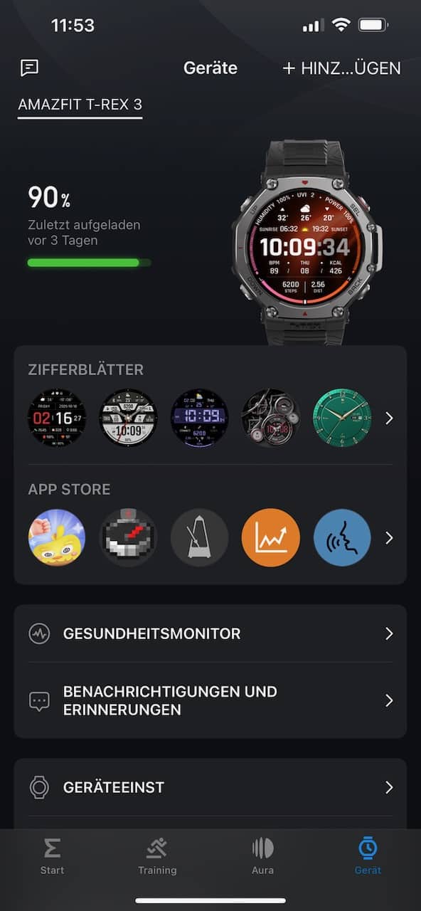 Für die Anzeige des Displays bietet die Uhr zwei praktische Optionen: Zum einen kann ein Always-On-Display aktiviert werden, das die wichtigsten Informationen dauerhaft sichtbar macht. Zum anderen lässt sich das Display automatisch einschalten, wenn das Handgelenk angehoben wird. Diese Funktion arbeitete im Test zuverlässig und kann bei Bedarf in ihrer Sensibilität angepasst werden, um den individuellen Vorlieben gerecht zu werden.Eine weitere Stärke der T-Rex 3 ist die große Auswahl an Watchfaces, die über den integrierten App Store heruntergeladen werden können. Während diese Vielfalt viele Geschmäcker abdeckt, sind die Möglichkeiten zur Individualisierung der Watchfaces begrenzt. Nur wenige Designs lassen sich anpassen, und selbst hier sind die Anpassungsoptionen eingeschränkt. Dadurch kann es trotz der breiten Auswahl schwierig sein, ein optimales Design für persönliche Vorlieben zu finden.
