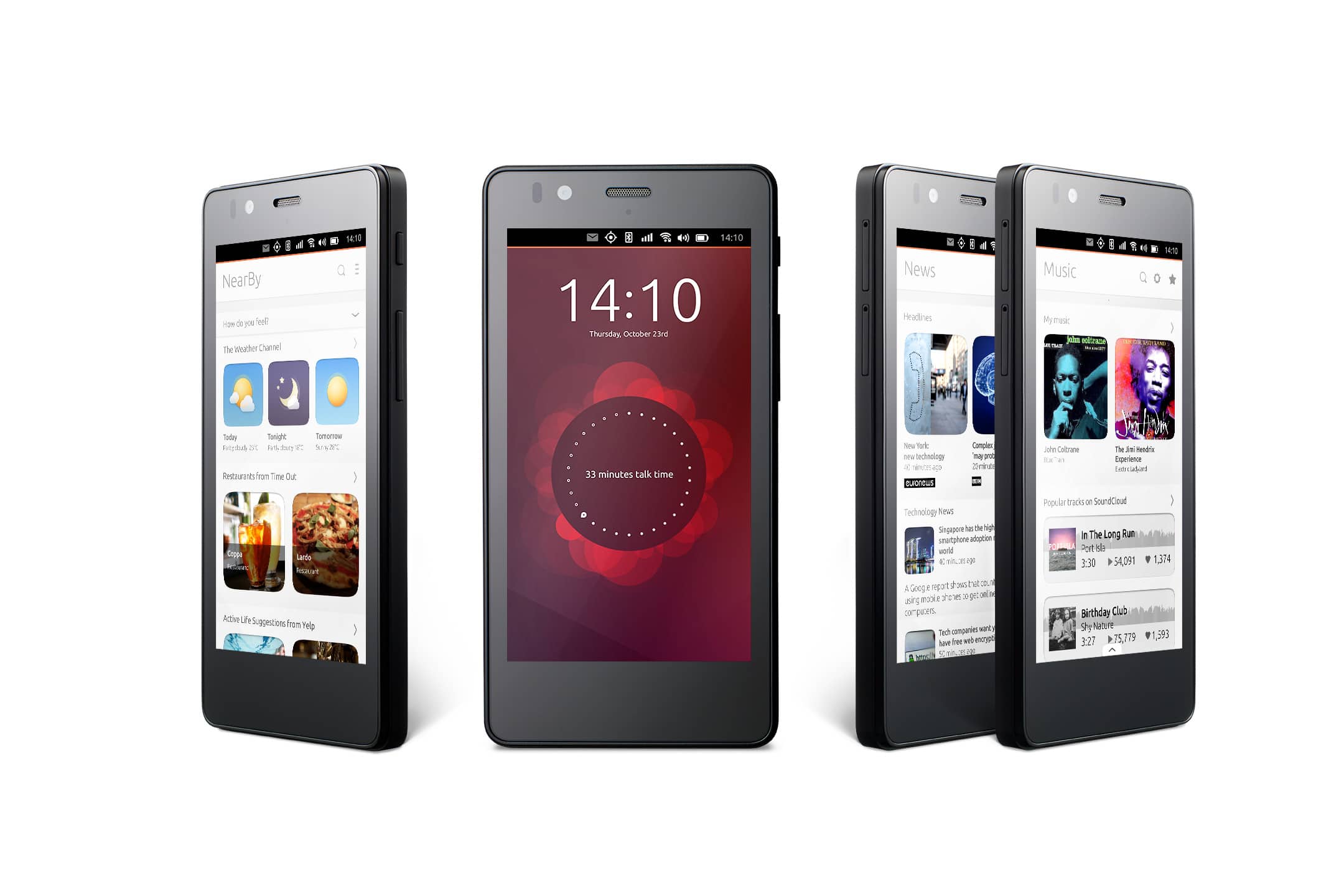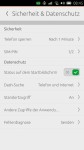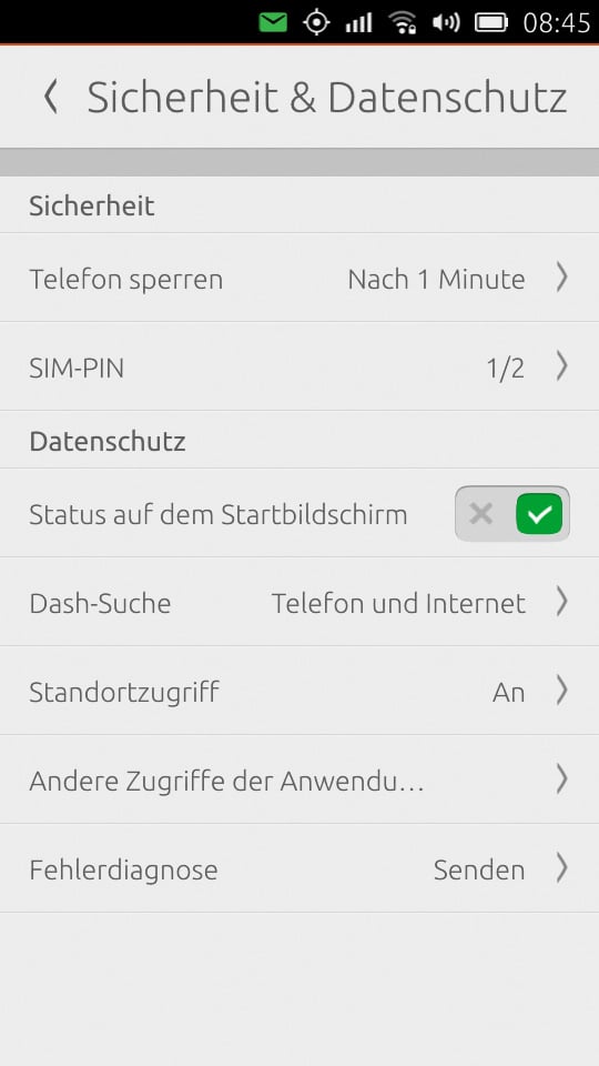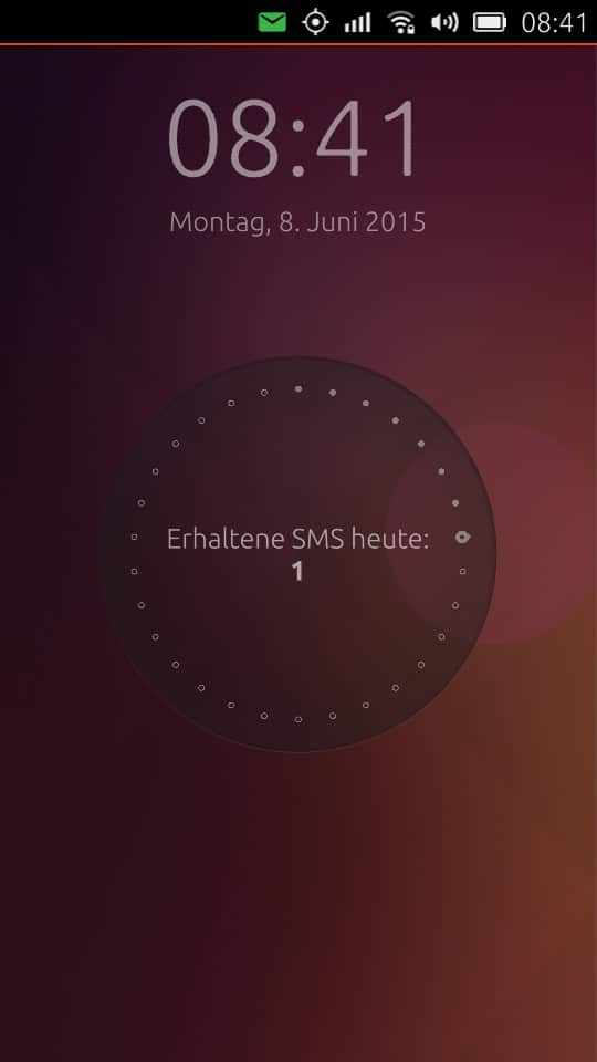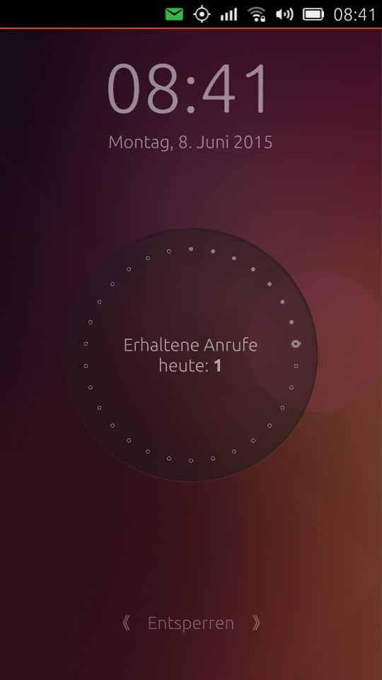 Genauso wie bei den üblichen Smartphone-Betriebssystemen bietet Ubuntu Phone einen Sperrbildschirm. Dieser beinhaltet Informationen zu verpassten Anrufen, Nachrichten etc. Diese werden jedoch nicht alle auf einmal angezeigt, sondern es kann zwischen den verschiedenen Infos gewechselt werden. Entsperrt wird der Bildschirm dann einfach mit einem Wisch nach links oder rechts. Anschließend gibt es die üblichen Abfragen wie z. B. Muster, PIN oder auch gar nichts.