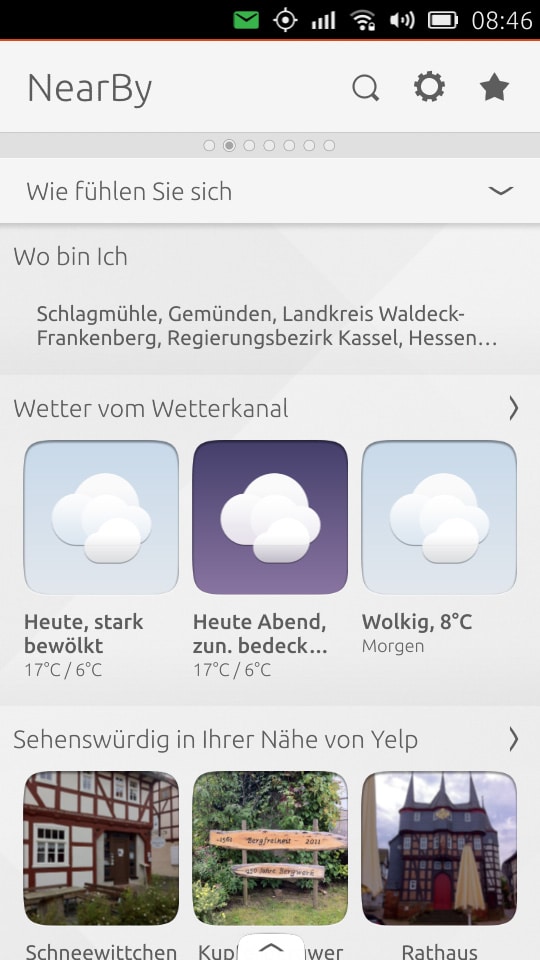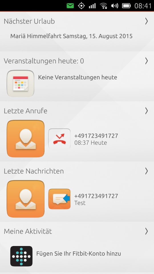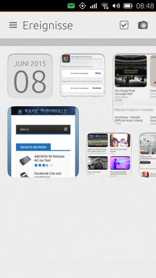 Nach dem Entsperren könnt ihr den ersten Scope – den Heute-Scope sehen. Da die Scopes eine grundlegende Funktion innerhalb von Ubuntu Phone einnehmen, erkläre ich diese später gesondert.