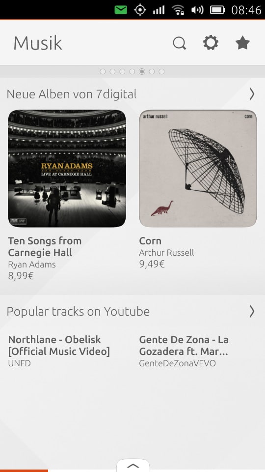 Kommen wir nun zu den Scopes – dem wohl größten Erkennungsmerkmal von Ubuntu Phone im Vergleich zu Android, iOS oder Windows Phone. Ubuntu Phone besitzt nämlich keinen normalen Home-Screen, sondern sogenannte Scopes. Diese sammeln Informationen aus verschiedenen Quellen und stellen diese aufbereitet vor. Bilder zu den einzelnen Scopes findet ihr in der Gallerie am Ende dieses Abschnitts.