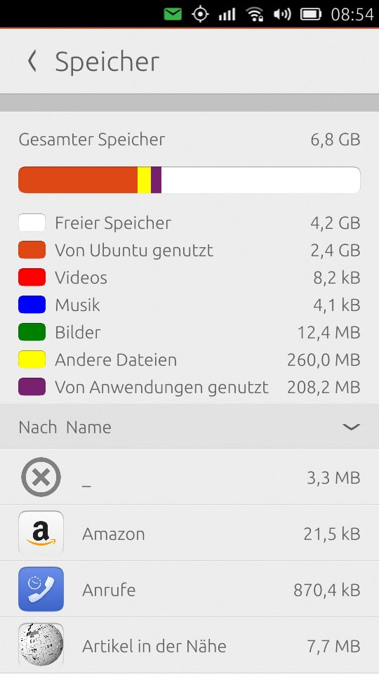 Als interner Speicherplatz sind 8 GB verbaut, wovon 2,5 GB vom System belegt sind. Euch stehen also noch 5,5 GB für eure Dateien und Apps zur Verfügung. Durch eine microSD-Karte kann der Speicher noch um 32 GB erweitert werden.