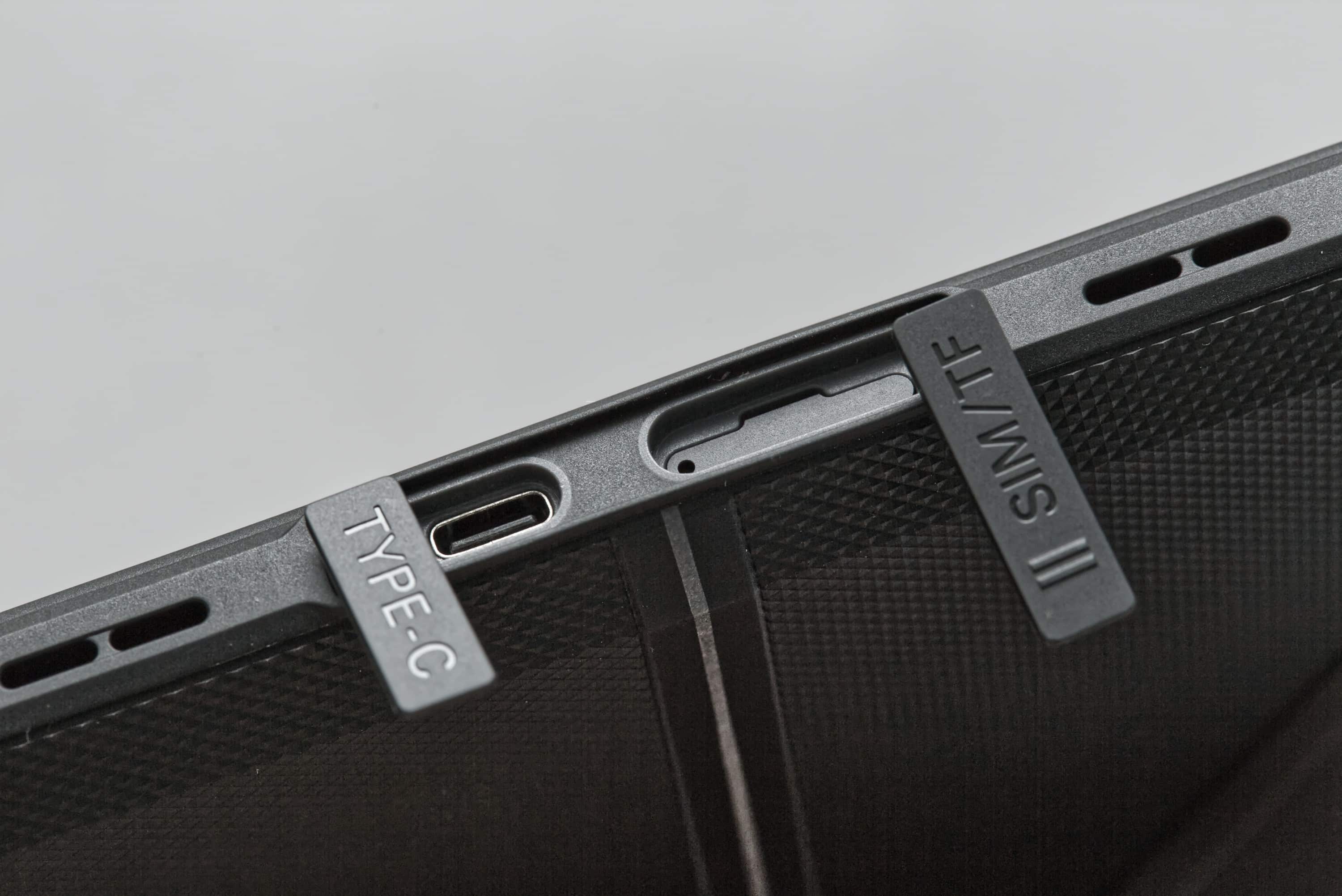 Primär ist das der Schutz vor Umwelteinflüssen. So ist das Fossibot DT1 IP68-zertifiziert und somit wasserfest und gut vor Staub geschützt. Eine Anmerkung dazu: Durch Wasser entstehen zwar keine Schäden, aber ein nasses Display kann im Betrieb durchaus zu unerwarteten Verhaltensweisen und problematischer Bedienung führen. Für die Erhaltung des Wasserschutzes finden sich Silikonabdeckungen für den USB-C-Anschluss auf der Unterseite und den Träger für die SIM- und Micro-SD-Karte direkt daneben. Auf andere Anschlüsse wird dagegen komplett verzichtet; so gibt es keinen physischen Anschluss für Kopfhörer. Hier muss also auf Bluetooth zurückgegriffen werden.